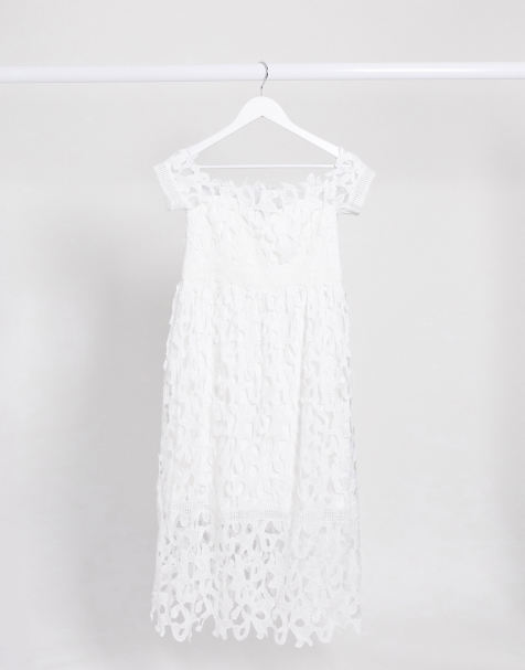 Chi Chi London Bardot Chi Chi London Petite Premium Lace Dress Cutwork Detail And Cap Sleeve